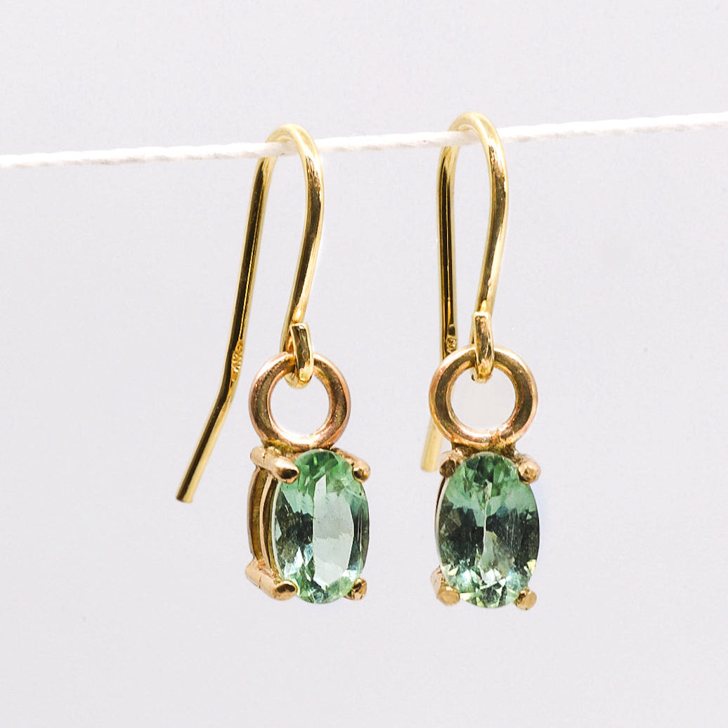 These delicate 10k gold earrings feature oval-cut green tourmaline stones. Set in a simple prong setting, the natural green hue of the tourmaline is enhanced by the warm tones of the gold. These lightweight earrings are perfect for adding a subtle hint of color to your everyday style.