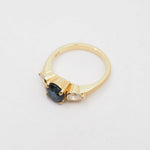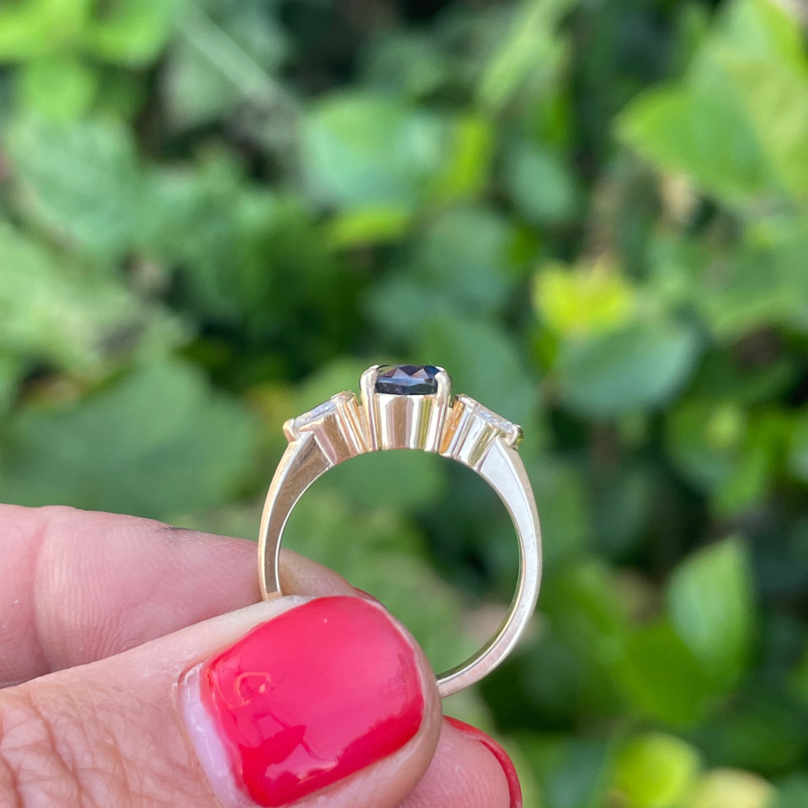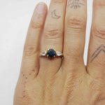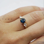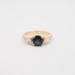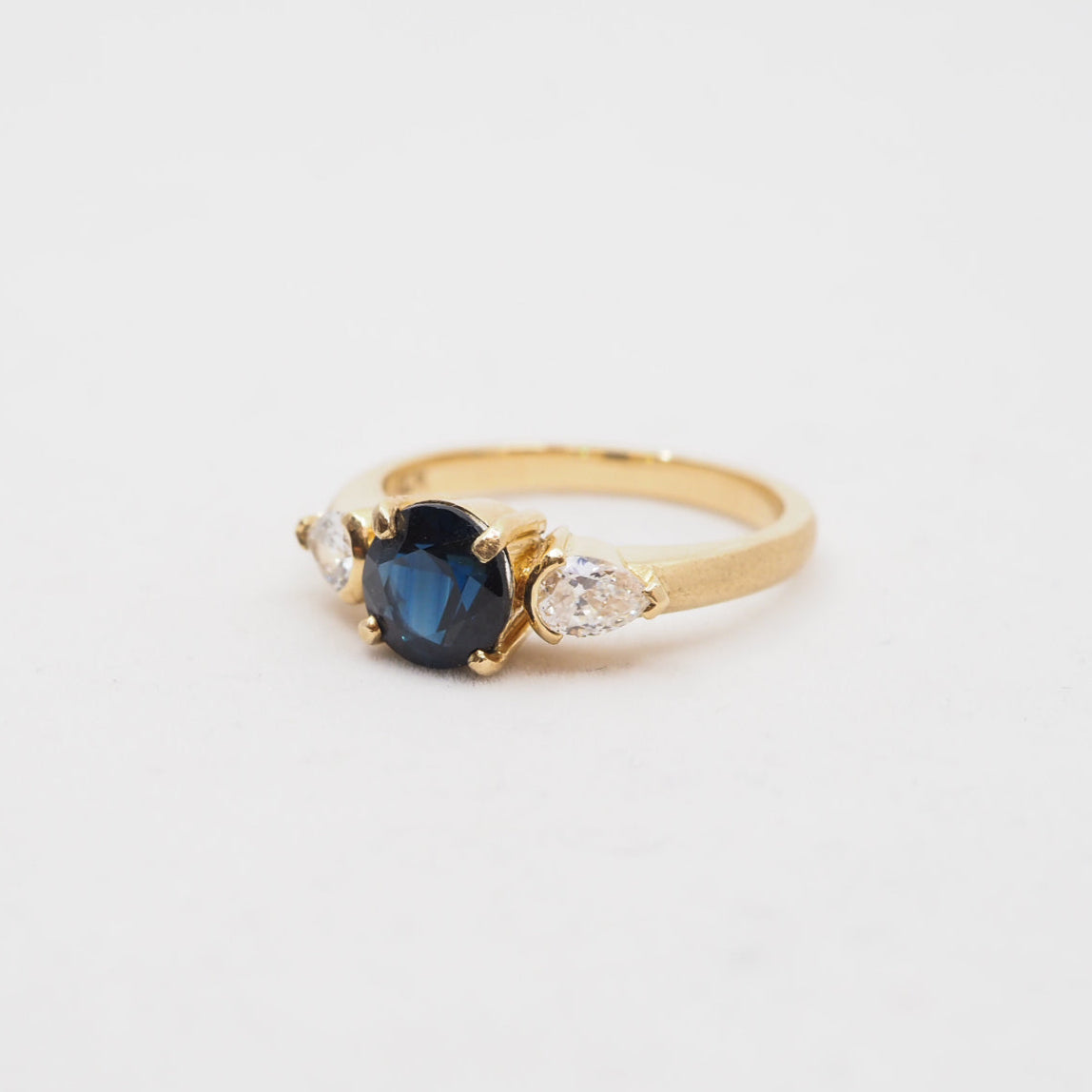 A stunning 1.55ct opulent deep blue sapphire held softly by 2 white faceted pear shaped diamonds .20ct each, giving classically antique feels.
