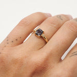 This spectacular cushion cut Spinel is nestled between two Champagne Diamonds. Its unique purple hue is complimented perfectly by the warm tones of the Champagne Diamonds. A truly unique trio. Designed in Tofino, BC.