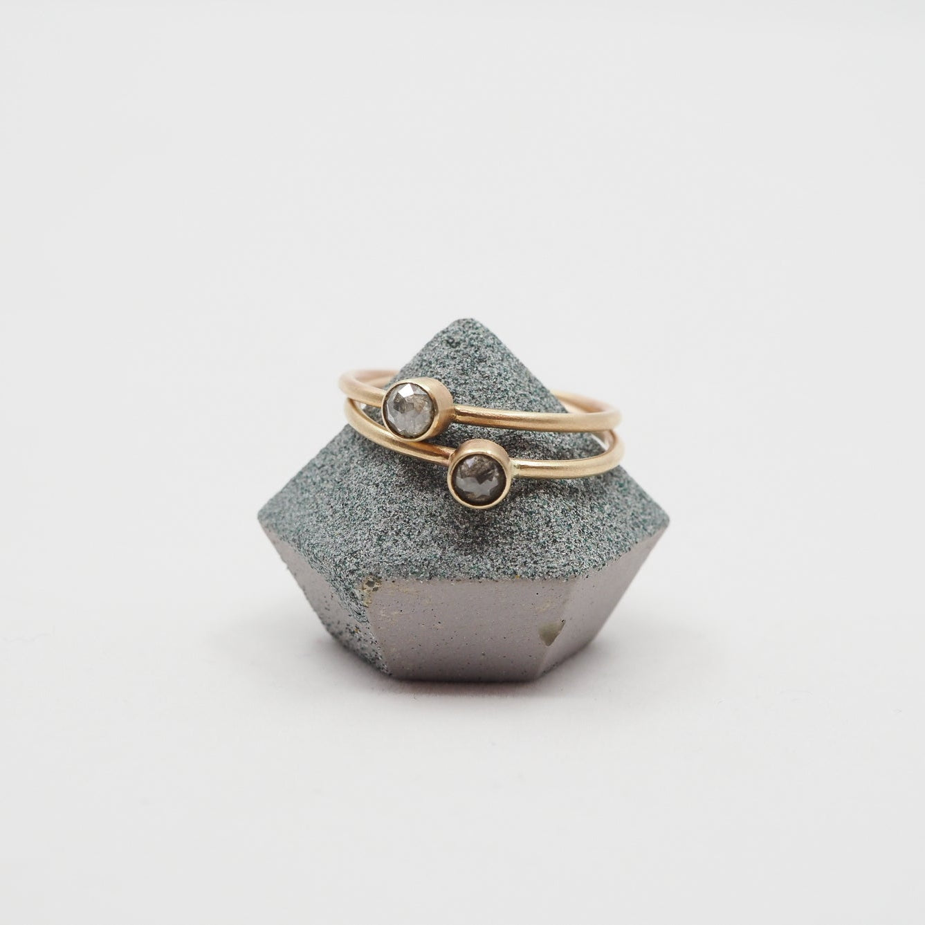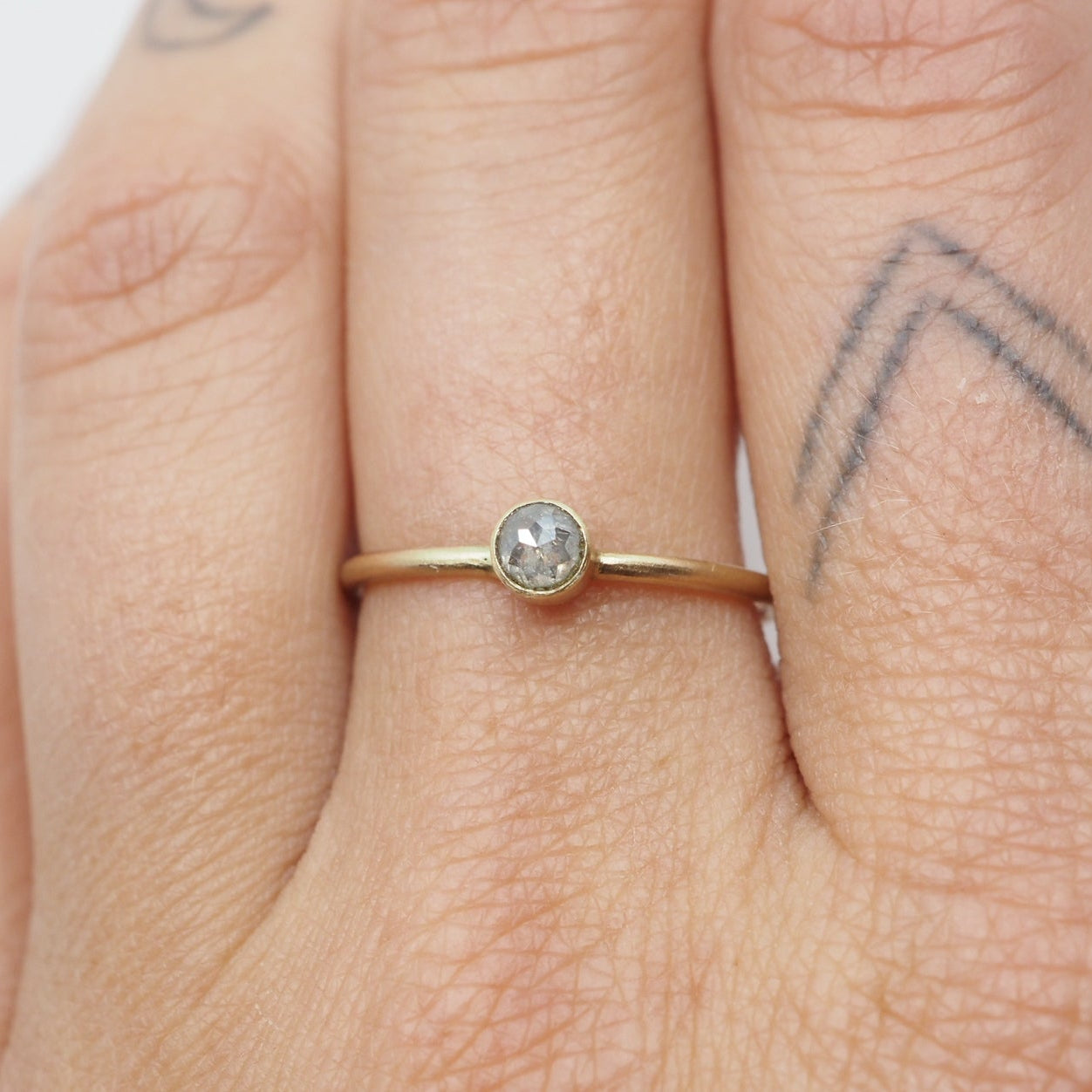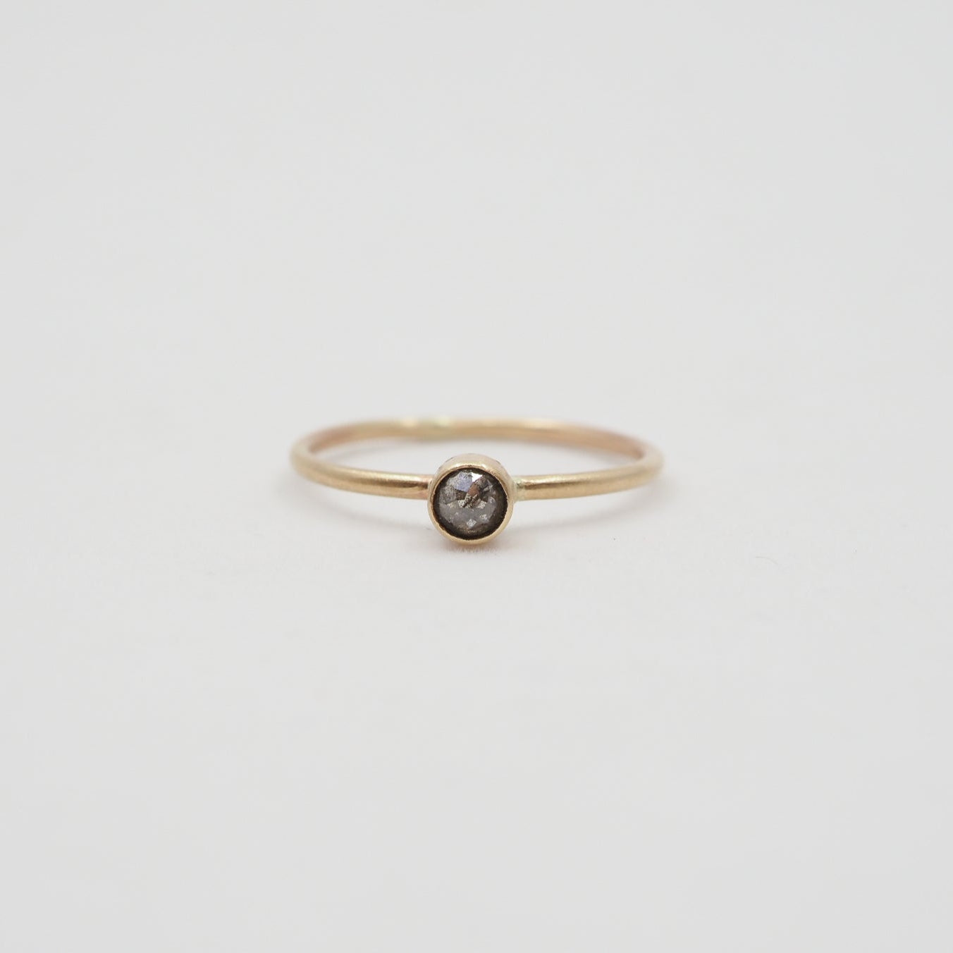 This beautiful solitaire Salt & Pepper Diamond ring is set in 10K Gold and brushed for a matte satin finish. Organic, distinctive and one-of-a-kind. Each Salt & Pepper Diamond is unique to its own.