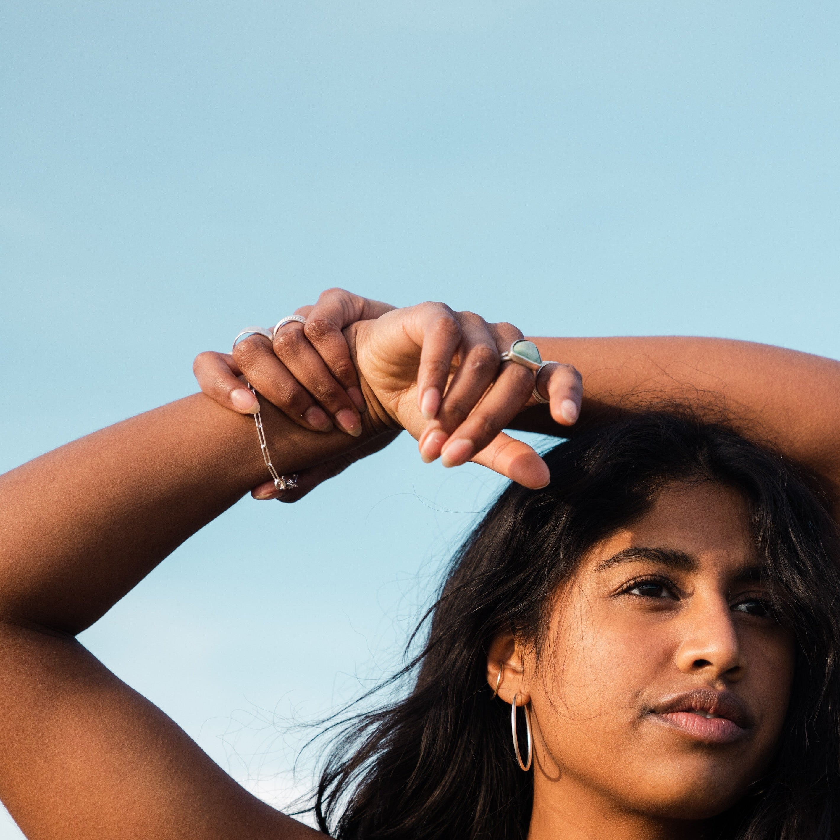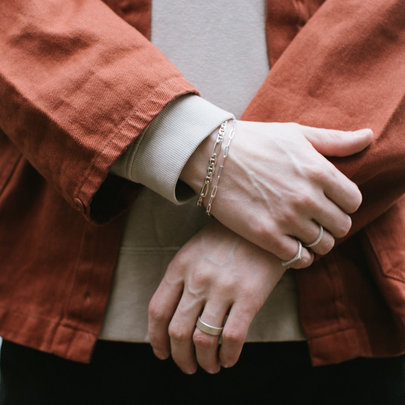 Paired here with our Sterling Silver Herringbone Necklace, Sterling Silver Wave Love Necklace, & Sterling Silver Rue Bracelet