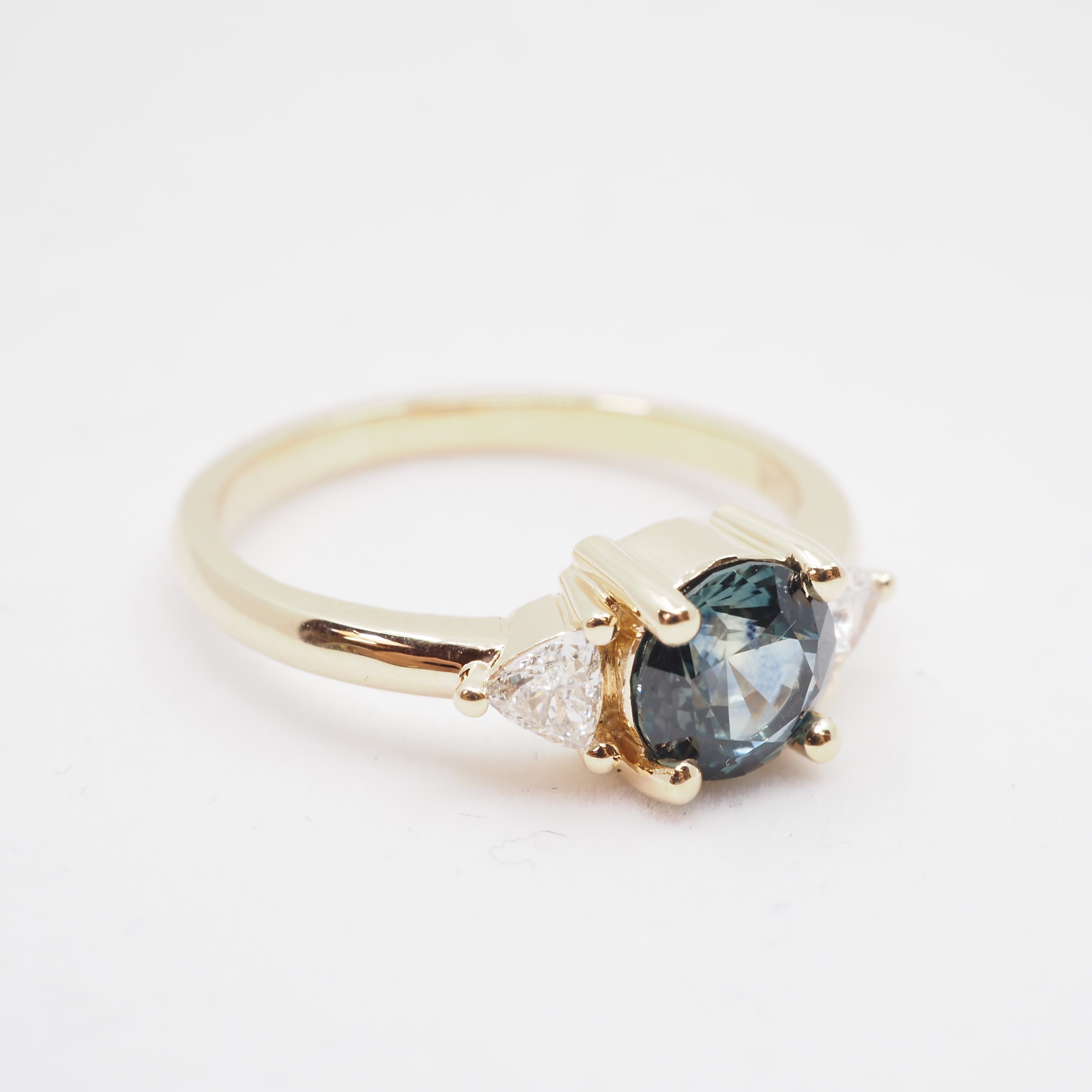 Two stunning trillion-cut White Diamonds perfectly frame this opulent centrepiece Montana Sapphire, cut brilliant to capture the light from all directions. Designed in Tofino, BC.