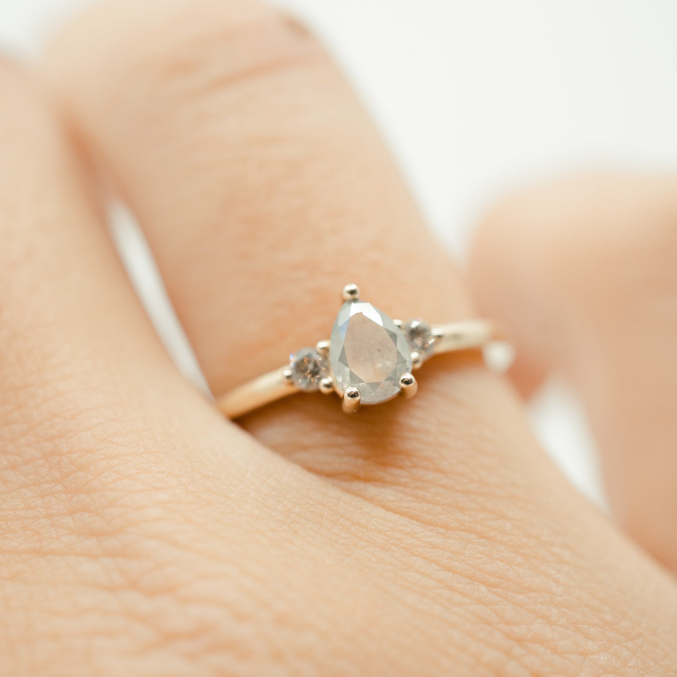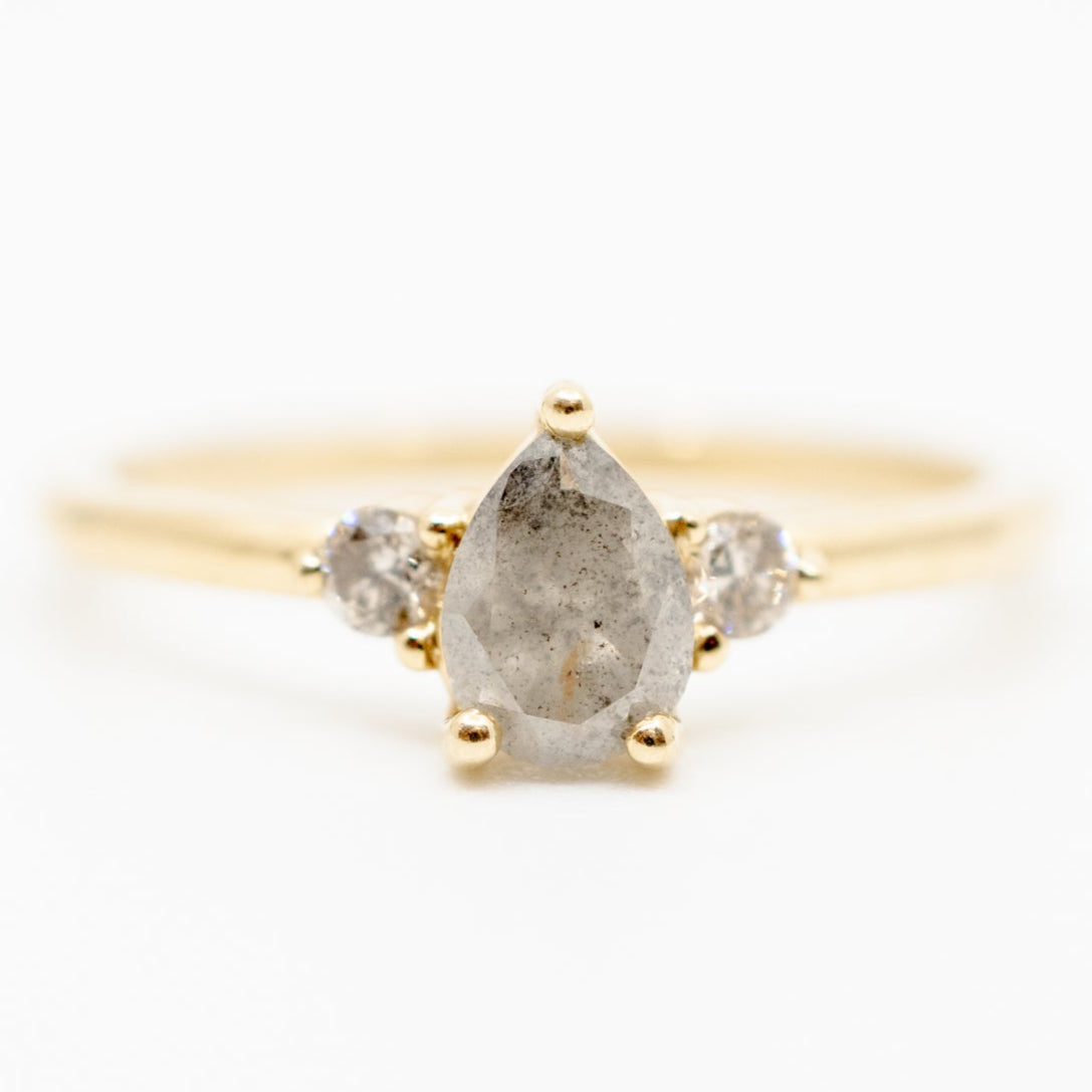 A unique and stunning Pear-Shaped Salt & Pepper Diamond set between two White Diamonds along a 14k Brushed Solid Gold Band. Designed in Tofino, BC.