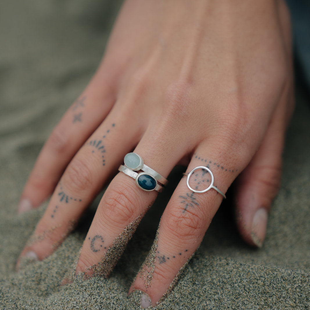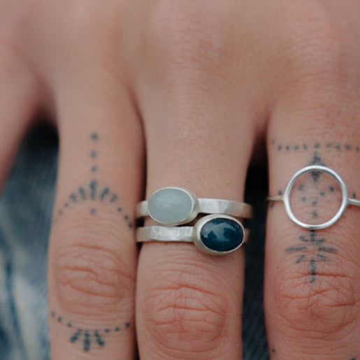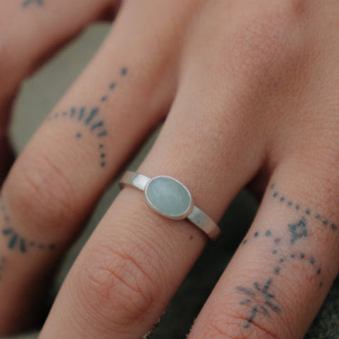 Our oval Aquamarine ring sits on our square hammered sterling silver band. Handmade in our Studio/Store, The Factory in Tofino, B.C.