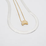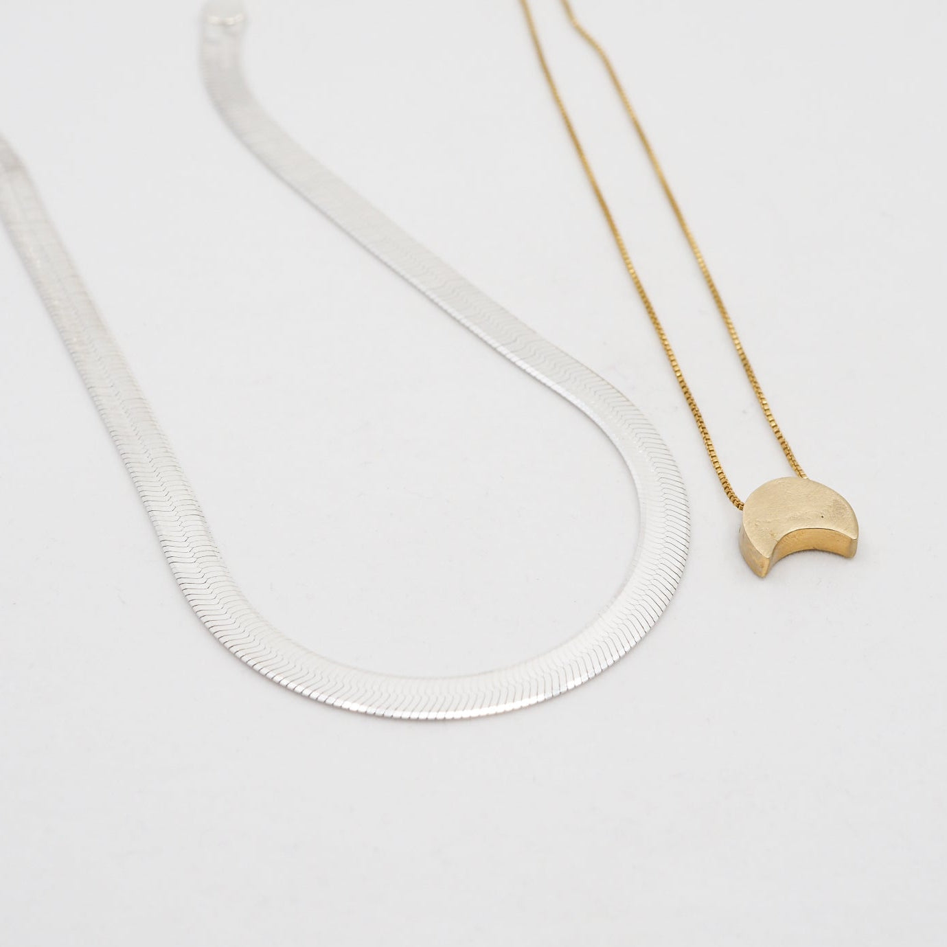 Enjoy this cute moonlit stack! Featuring a Sterling Silver Herringbone Necklace and our Gold Plated Luna Necklace. These two compliment each other perfectly, pulling out the glow of each metal.