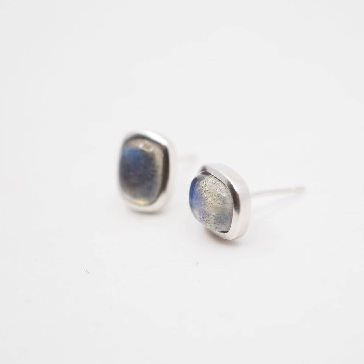 Gorgeously unique Labradorite studs. These wondrous earrings are smooth with cabochon-cut labradorites to add an effervescent glow from every angle. Flecks of blue, peppered with unique inclusions will capture your eye.