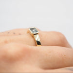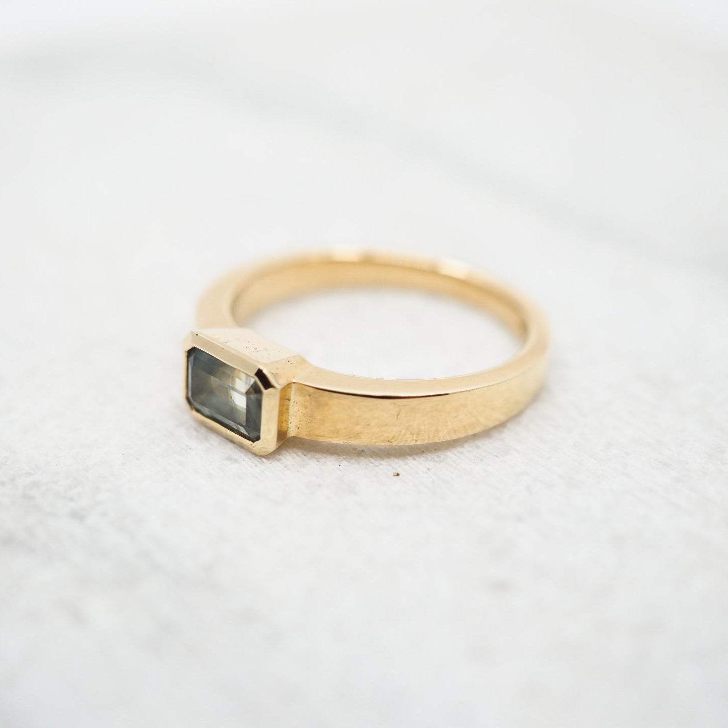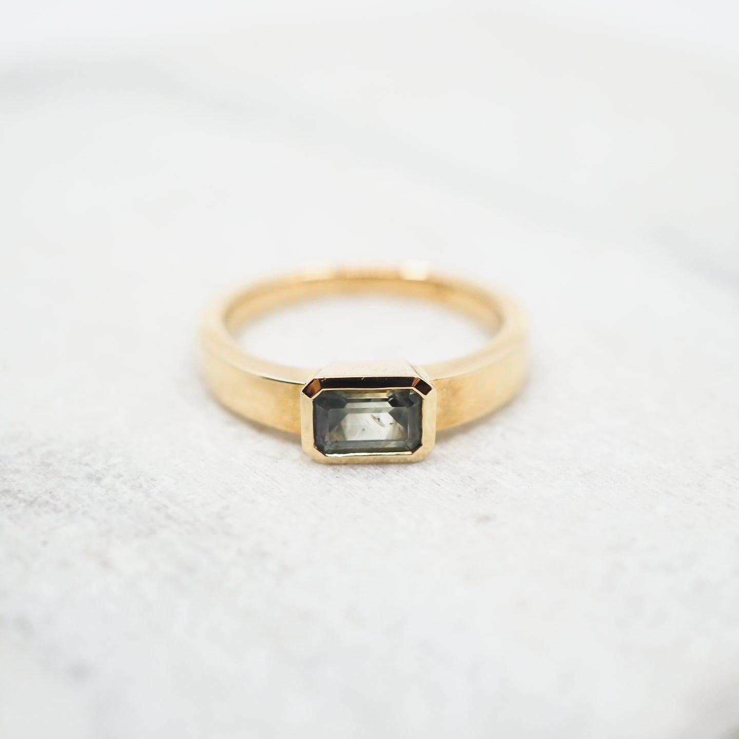 Handpicked by Lisa, this one-of-a-kind Montana Sapphire is a truly mesmerizing stone. Set in 14k solid gold to accentuate its soft hues of light blue. The unique 'silk' in the stone gives a slightly hazy glow that appears playfully through its Emerald Cut. Unique is an understatement.